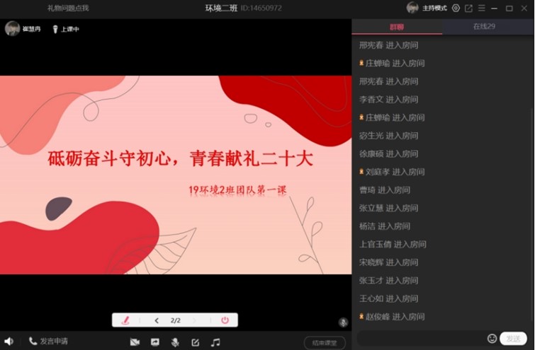 2019级环境生态工程2班团支部学习了党的十九届六中全会精神、习近平总书记在深入推动黄河流域生态保护和高质量发展座谈会上的重要讲话精神、习近平总书记关于青年工作的重要思想和重要论述,朗读了《习近平和大学生朋友们》一书的部分章节。团支部书记崔慧冉说:“我们要以更加坚定的信念和朝气蓬勃的精神面貌奋力进取,以优异的学习成绩和竞赛成绩为党的二十大献礼,不辜负党对青年寄予的厚望和时代赋予的光荣使命!”