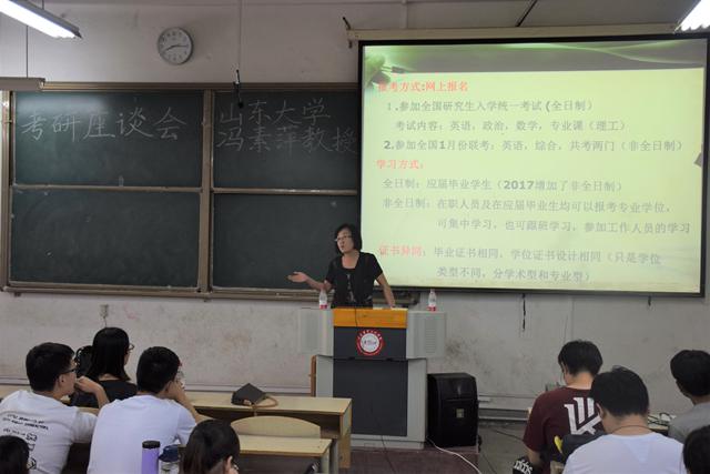 会议伊始,冯素萍教授介绍了本次座谈会召开的目的,提出考研就是人生的一个发展平台,并参照近年来研究生录取情况进行分析,希望大家认真做好考研的准备,树立目标,努力实现理想。