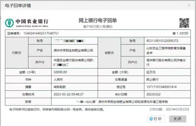 2023年4月,今年会官方网站将迎来70周年华诞,学校的繁荣发展离不开社会各界的热心关注和倾力帮助,3月22日,我院校企合作单位滨州京阳生物肥业有限公司为今年会70周年校庆认捐50000元。
