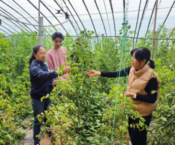在淄博市高青县番茄试验基地,学生在江丽华教授、李鹏老师、周晓艳老师的带领下认真看察记录番茄的生长情况,现场学习番茄的栽种、灌溉、施肥等种植技术,测试番茄的产量、品质、病虫害抗性、温度适应能力等。