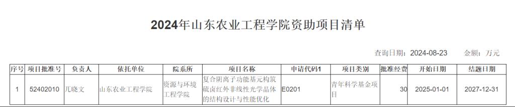 近日,国家自然科学基金委员会公布了2024年国家自然科学基金集中接收申请项目评审结果,学院兀晓文博士申报的《复合阴离子功能基元构筑硫卤红外非线性光学晶体的结构设计与性能优化》项目获立项。国家自然科学基金作为我国科学研究的重要资助渠道,竞争激烈,能在众多申请者中脱颖而出,实属不易。
