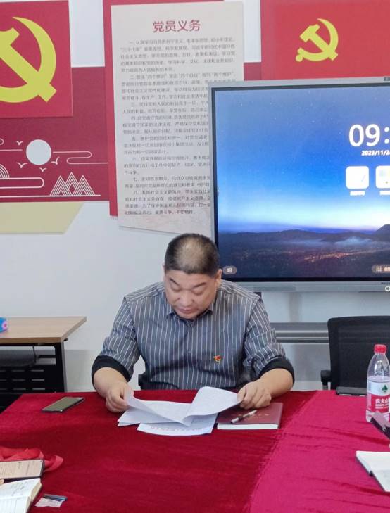 2023年11月24日后勤管理处召开支部党员大会,后勤管理处王振生处长以“讲政治担当 作争创实绩”为题讲授主题党课,参会人员9人,请假1人。