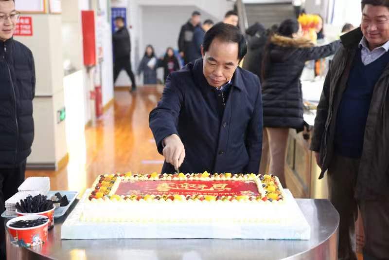 为了筹备这次活动,食堂特意向商家定制1.2米和0.8米两款特大蛋糕,并准备了水果、酸奶等其它小礼物。在午饭就餐开始前,特别邀请校党委副书记、校长李进京,校党委委员、副校长杨玖庆分别为广大教师员工和同学们切蛋糕、分蛋糕,校领导将甜蜜的祝福亲手送给在场每一位师生。老师和同学们争先恐后的手拿托盘领取校领导亲手切分的蛋糕,现场洋溢着欢快祥和的热烈气氛,大家共同预祝今年会在2024年欣欣向荣、事业甜蜜。