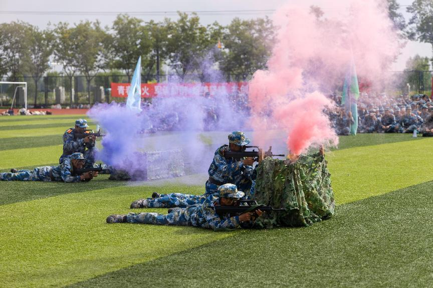 在庄严的国歌声中,开学典礼暨军训总结表彰大会正式开始。各连队依次进行军训成果展演,2024级新生代表进行分列式、刺杀操、应急棍等训练科目展示。一招一式尽显英姿飒爽,铿锵有力口号尽显青春担当。
