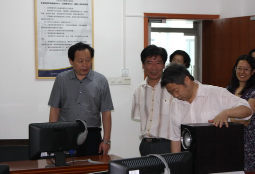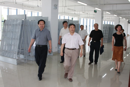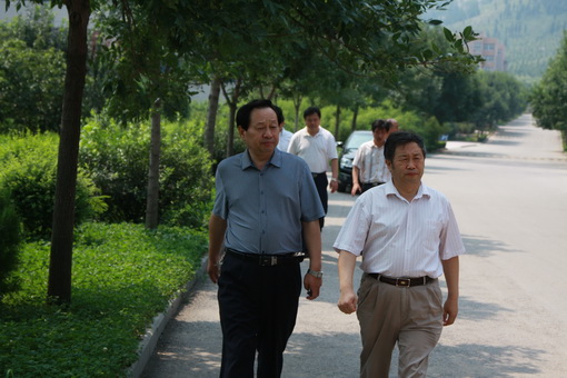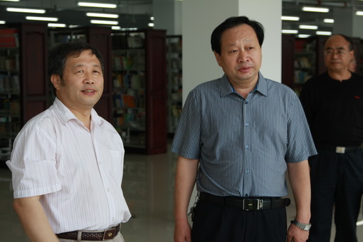 董忠堂书记(左二)在冯晋祥书记(左一)的陪同下实地察看图书馆