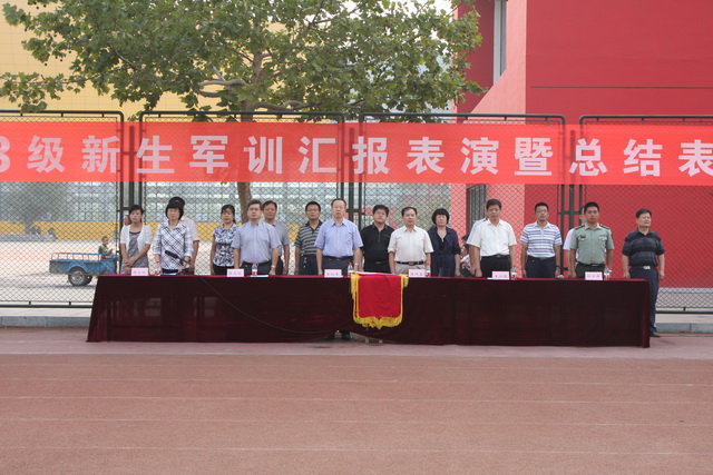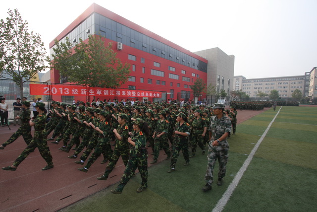 9月20日上午,2013级新生军训汇报表演暨总结表彰大会在我院南北两校区分别召开。院党委副书记王向军,副院长温传富、张兆明、王兴国,纪委书记杨永欣,承训部队军训团团长孙少锋以及有关处室和各系部的负责人出席大会并观看了汇报表演。大会由院纪委书记杨永欣主持。