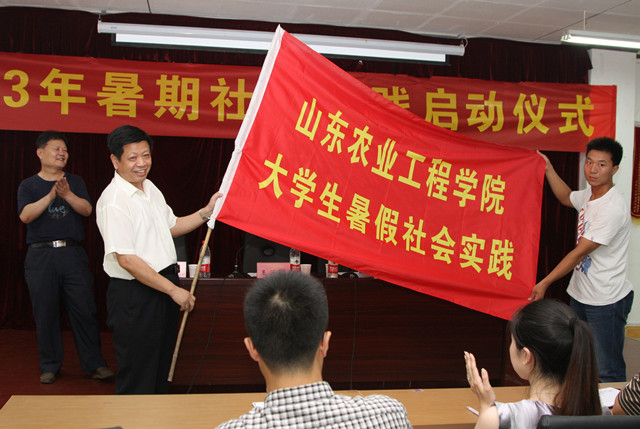 院党委委员、副院长王兴国首先代表院党委、院行政向积极参加暑期社会实践活动的老师和同学们表示亲切的问候。他指出,社会实践是大学生思想政治教育的重要环节,对于促进大学生了解社会、了解国情,增长才干、奉献社会,锻炼毅力、培养品格,增强社会责任感具有不可替代的作用。而今年的暑期社会实践活动正值我院改建升本后的开局之年,因此具有深刻的意义,他要求同学们要在社会实践活动中积极深入企业、农村和社区,广泛开展社会调研和社会服务,了解国情、民情,增强奉献意识和责任意识,化“被动”为“主动”,真正使暑期社会实践达到“受教育、长才干、作贡献”的目的。同时还向同学们提出了几点要求,希望同学们加强纪律性,注意安全,注重活动的宣传和活动成果的深化,圆满完成实践任务。随后,王院长为社会实践服务团队授旗。