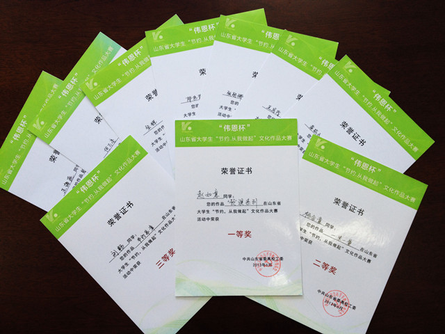 喜讯频传,由山东高校工委主办的全省大学生“节约,从我做起”文化作品大赛的评选工作于日前圆满结束,我院获优秀组织奖,我院艺术系学生赵如意同学获艺术设计类一等奖,杨金童同学获二等奖,刘畅同学获三等奖,秦晓玉等7名同学获优秀奖。6月28日,我院教师代表韩璐和获奖学生代表赵如意参加了山东省高校工委召开的表彰大会并领取奖项。