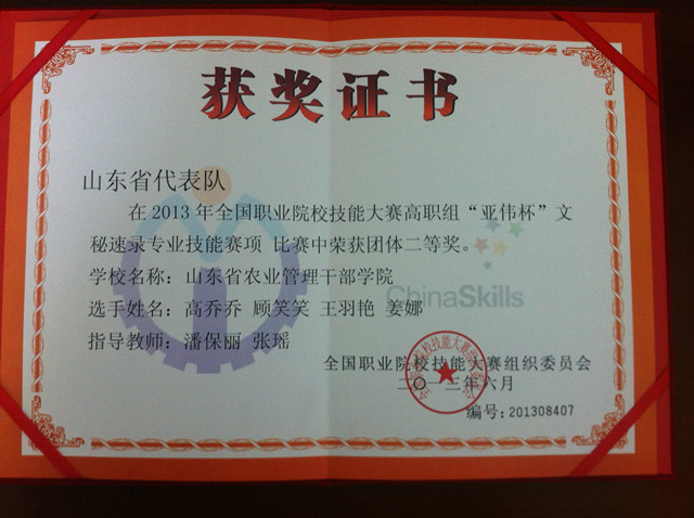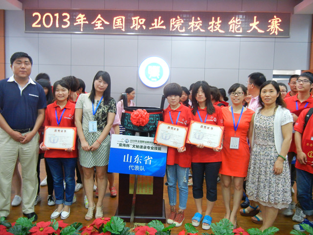 在今天刚刚结束的2013年全国职业院校技能大赛(高职组)“亚伟杯”文秘速录专业技能赛项中,我院学生队作为山东代表队参赛,荣获团体二等奖,为山东省和我院争得了荣誉。