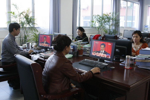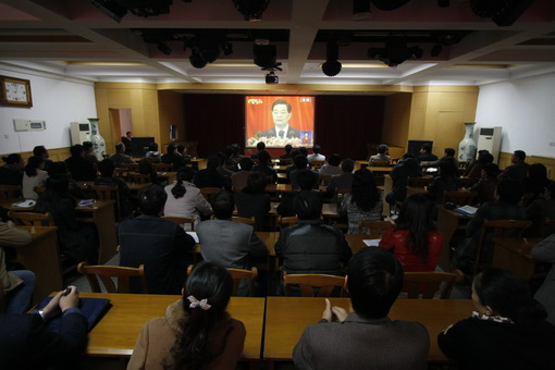 11月8日上午,举世瞩目的党的十八大在首都北京隆重开幕。我院组织处级以上党员干部、部分科级党员干部在院多功能厅聚精会神、满怀喜悦地收看党的十八大开幕盛况,认真聆听胡锦涛总书记在大会上作的《坚定不移沿着中国特色社会主义道路前进为全面建成小康社会而奋斗》工作报告。院党委书记董忠堂,党委副书记、院长李允祥,党委副书记王秀存、王向军,党委委员、副院长林松柏,副院长张兆明,党委委员、副院长王兴国,党委委员、纪委书记杨永欣参加了收看活动。部分师生员工通过网络、电视等各种方式收听收看了大会实况。
