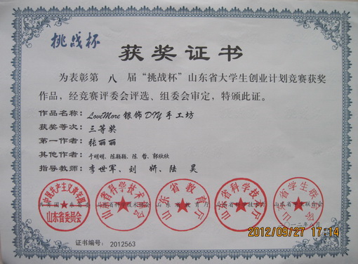 第八届“挑战杯”山东省大学生创业计划竞赛结果于日前揭晓,由我院张丽丽、于明明、陈颖颖、陈哲和郭欣欣同学组成的创业团队凭借“LoveMore银饰DIY手工坊”项目,一路过关斩将,喜获大赛三等奖。