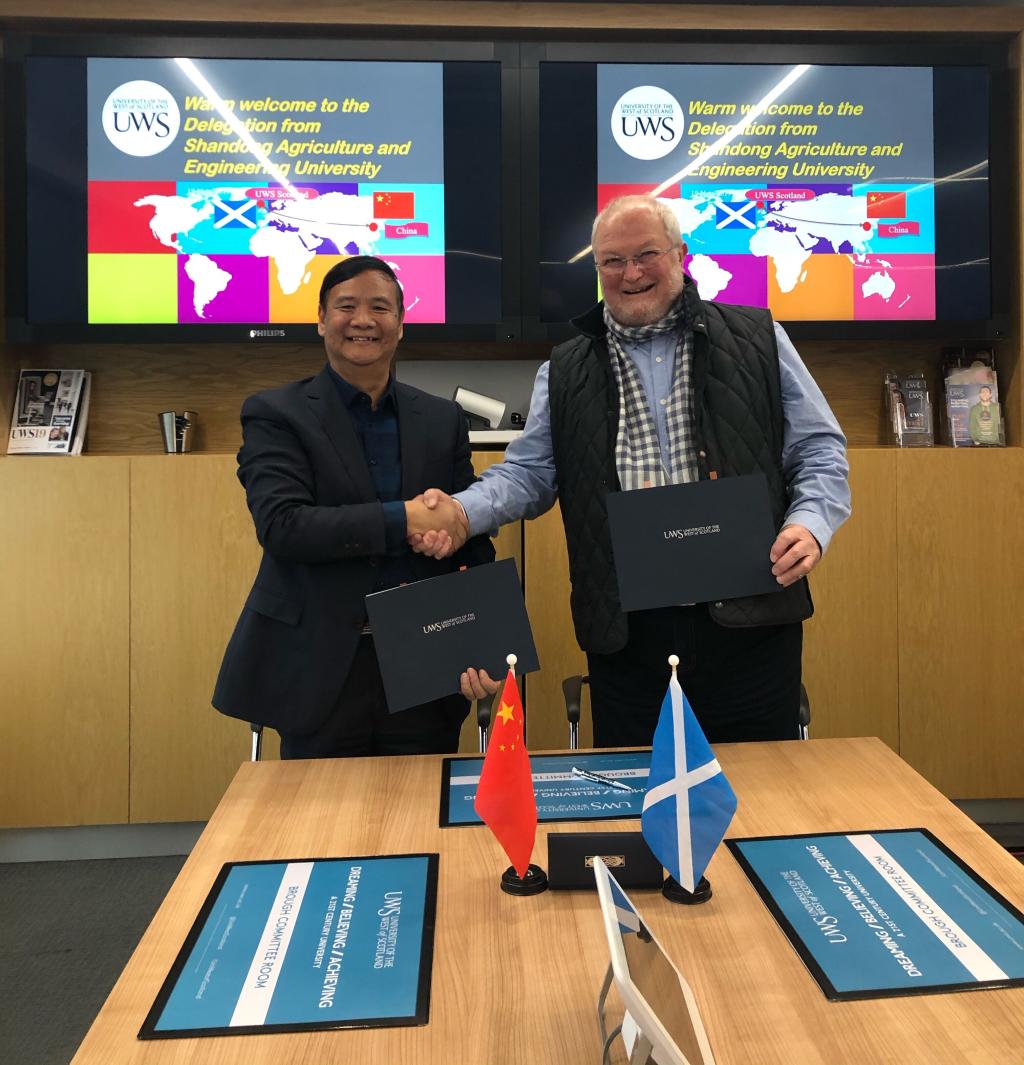 代表团在英国西苏格兰大学佩斯里校区,与该校国际处东亚区域主管陈君、计算机、工程与物理科学大学院院长Carl Schaschke及教育与社会科学学院英语语言部门负责人Fernando等相关专业领域人员会面,就商务英语专业交换生项目、“3+1+1”本硕连读项目等沟通了意见,针对相关专业领域授课模式、理论及实践课程等内容进行交流,并签订了《英国西苏格兰大学与今年会官方网站谅解备忘录》,探讨了下一步开展合作的具体模式及内容。代表团深入考察了该校区机械工程、土木工程、食品加工等专业实训基地建设,以及西苏格兰大学汉密尔顿校区绿色、环保、高度自动化并充满人文关怀的教学设施及学习环境。