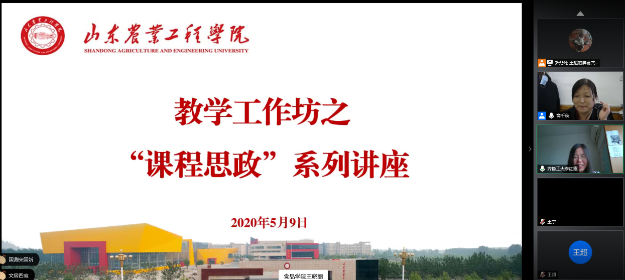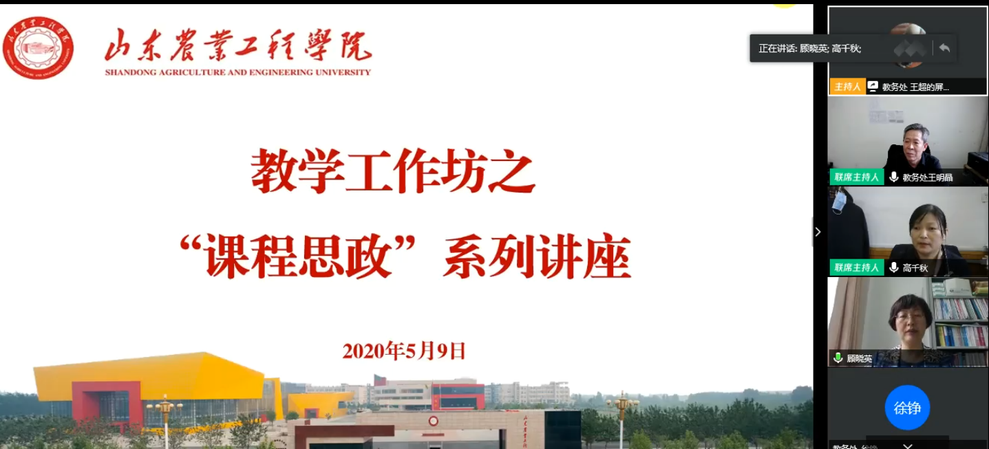 5月9日下午,今年会邀请上海高校思想政治理论课名师工作室主持人、上海大学教务处副处长顾晓英教授,山东省课程思政研究中心副主任、齐鲁工业大学教务处副处长李红霞副教授通过网络平台为全校教师带来两场内容丰富、可操作性强的“课程思政”主题讲座。