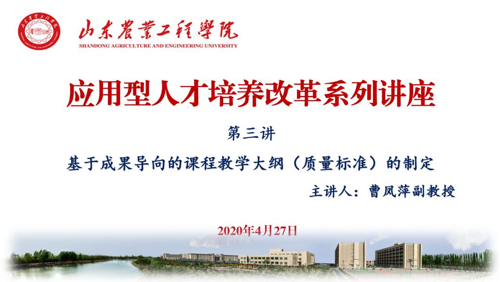 4月27日,山东交通学院交通运输专业负责人曹凤萍副教授作了题为“基于成果导向的课程教学大纲(质量标准)的制定”专题报告。曹凤萍基于成果导向,重点以交通运输专业的汽车理论为例,从OBE理念、课程大纲制定的目的和思路、课程大纲撰写举例、课程质量评价和毕业要求达成度评价等五个方面详细解读了课程教学大纲的编制思路和过程。