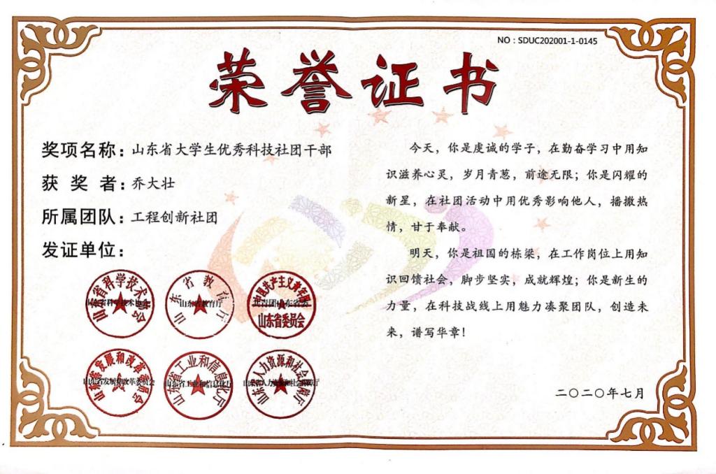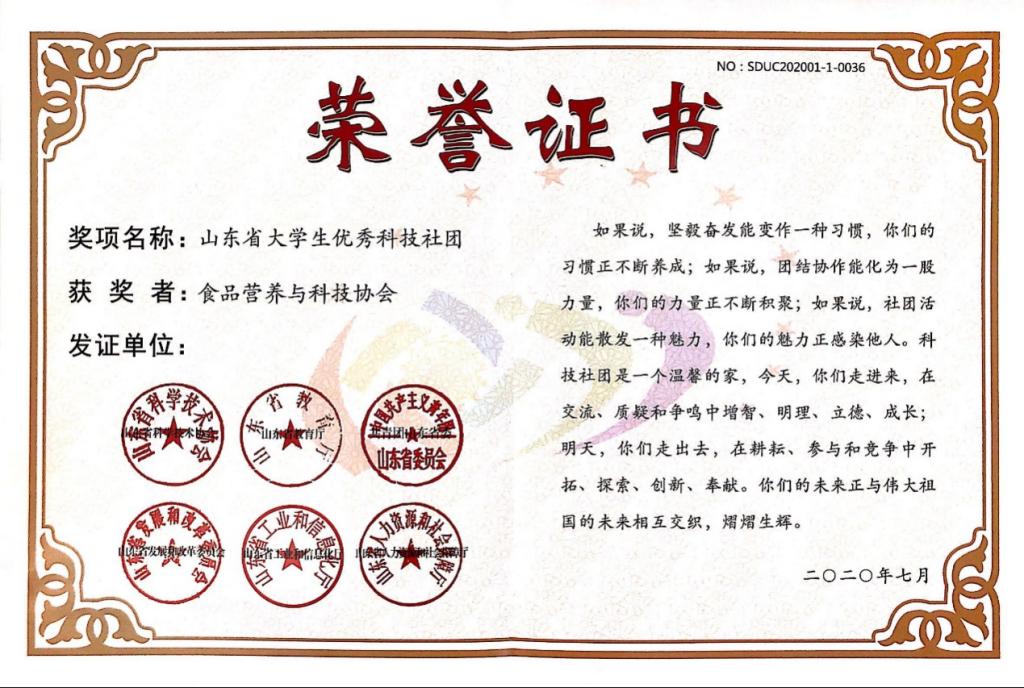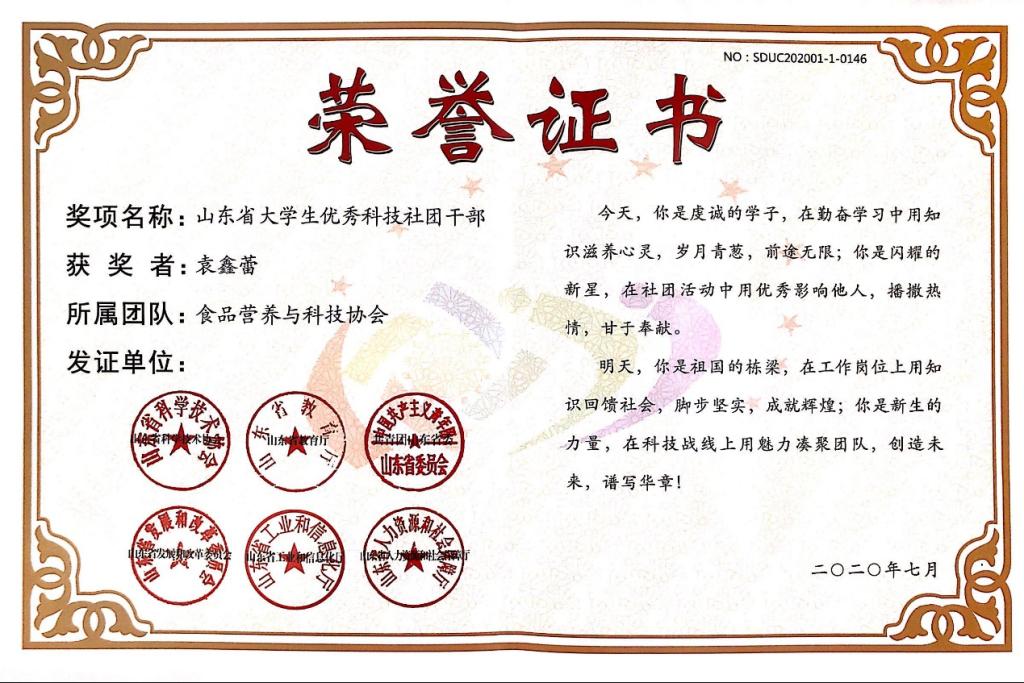 近日,由省科协、省教育厅、团省委、省发展改革委、省工业和信息化厅、省人力资源社会保障厅共同开展的2020年山东省大学生优秀科技社团和优秀科技社团干部评选活动落幕,经过选拔、推荐和严格评审,今年会食品营养与科技协会被评为“2020年山东省大学生优秀科技社团”,食品营养与科技协会副社长袁鑫蕾和工程创新社团负责人乔大壮荣获“2020年山东省大学生优秀科技社团干部”荣誉称号。