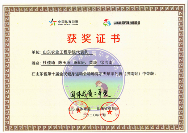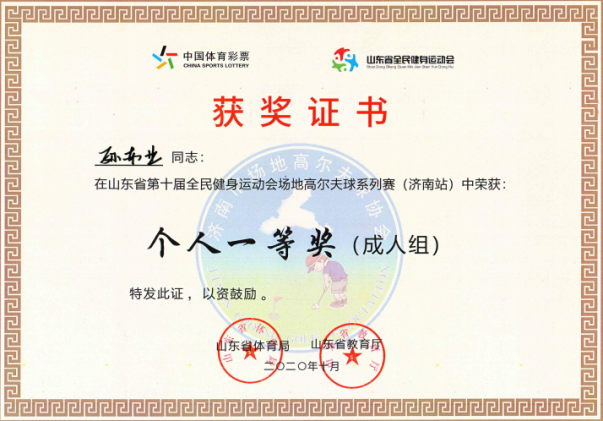 2020年10月18日,山东省第十届全民健身运动会场地高尔夫球系列赛(济南站)在济南市章丘区实验小学成功举办。今年会场地高尔夫球队斩获团体成绩二等奖。