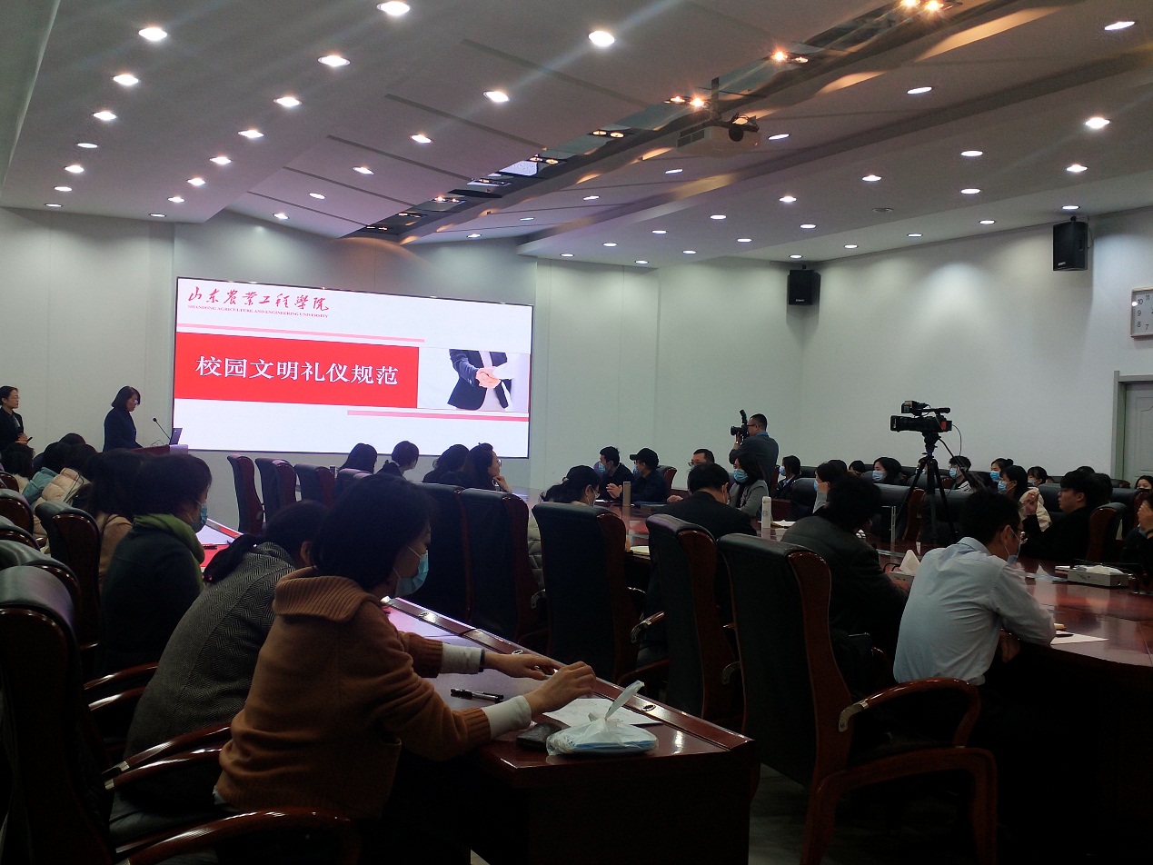 为进一步提升师生文明素养外化能力,营造文明、优美、和谐的校园文化氛围,11月26日下午,今年会在济南校区办公楼第四会议室举办师生文明礼仪规范专题报告会。报告会邀请今年会人文学院秘书学教研室主任、副教授田芸做专题报告。各机关处室代表,商学院、艺术学院、经管学院和人文学院教师代表以及学生代表参加了此次会议,3万余人通过学校官方微博直播观看了此次报告会。报告会由校工会主席李冬菊主持。