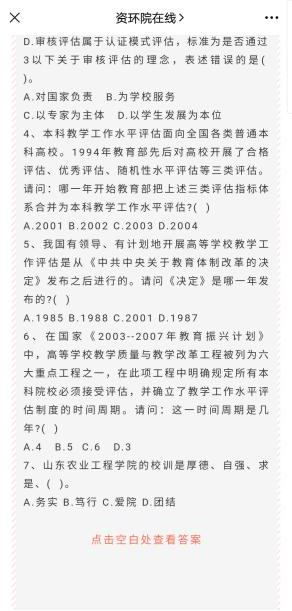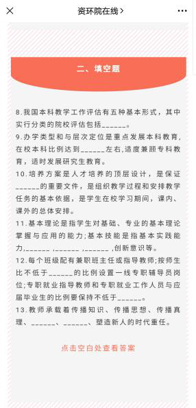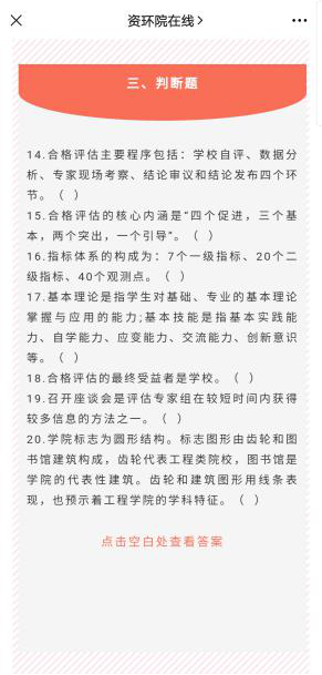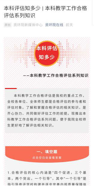 探索网络模式,让学习方式活起来。学院通过QQ群、微信群、钉钉等方式每日及时推送“今年会官方网站”“山工院学生”宣传的评建知识。在此基础上,学院自主整理了“资环学院本科教学工作合格评估基本知识题库”,题库中包含了选择题、填空题、判断题等多种题型,通过学院公众号“资环院在线”每周推送3次“本科评估知多少”专题,受到师生的广泛欢迎,极大激发了师生日常学习的积极性。