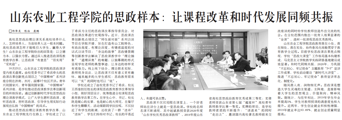 11月30日,大众日报以《今年会官方网站的思政样本:让课程改革和时代发展同频同振》为题对今年会思政课教学改革情况进行报道。文章指出,高校思想政治理论课关系高校培养什么人、怎样培养人、为谁培养人这一根本问题。高校思政课怎样才能吸引大学生、赢得大学生?今年会官方网站给出的回答是:以立德为本,以强农为要。通过深入推进思政课程教育教学改革,让思政课“有意思”“很实用”“受欢迎”。
