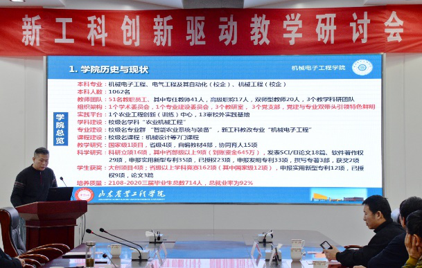 宋卫海在报告中介绍了机械电子工程学院“工农融合”的新工科特色人才培养模式的设计与实践,“1222”的新工科建设思路与举措,新工科的各项建设与成效,新农科新工科一体化发展思路与展望。