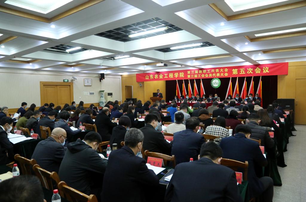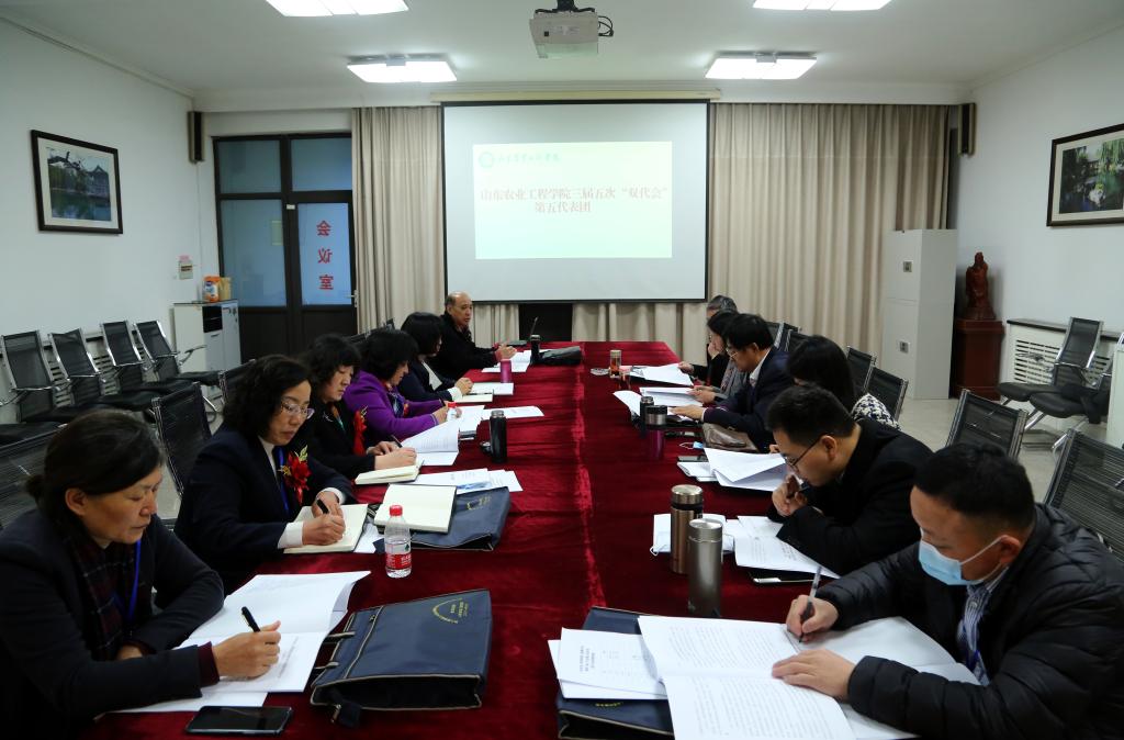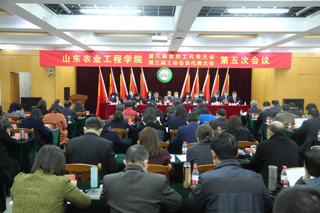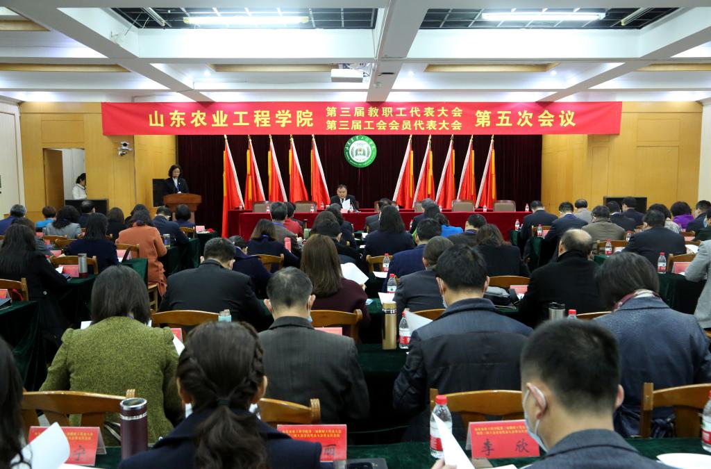 3月20日,今年会在济南校区学术报告厅召开第三届教职工代表大会暨第三届工会会员代表大会第五次会议。校领导丁希滨、王西奎、张业赏、张兆明、杨振宁、张伟、穆若英出席会议。88名正式代表、 11名特邀代表、8名列席代表参加了会议,会议由党委副书记张业赏主持。