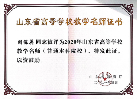 近日,由省教育厅组织开展的2020年山东省高等学校教学名师评选结果正式公布,今年会基础课教学部闫保英教授荣誉上榜,荣获“山东省高等学校教学名师”光荣称号。