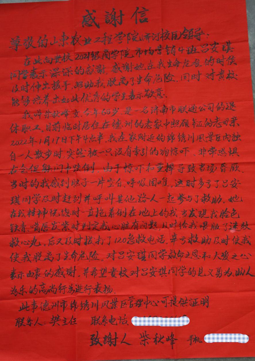 1月17日下午,吕安琪同学在山东省德州市锦绣川景区和一位68岁的老人同向行走时,老人被突然冲过来的狗惊吓摔倒,致昏厥失去意识。吕安琪见状急忙呼叫其他路人帮忙,帮这位老人翻身、摘下口罩顺畅呼吸;见老人嘴唇发紫、呼吸急促,及时采取救助措施,而后拨打120急救电话约来救护车,并将其送上救护车入院。因救助及时,老人脱离了生命危险,现已康复。为表达对学校和学生的感谢,柴秋峰老人寄来充满深情和敬意的感谢信。