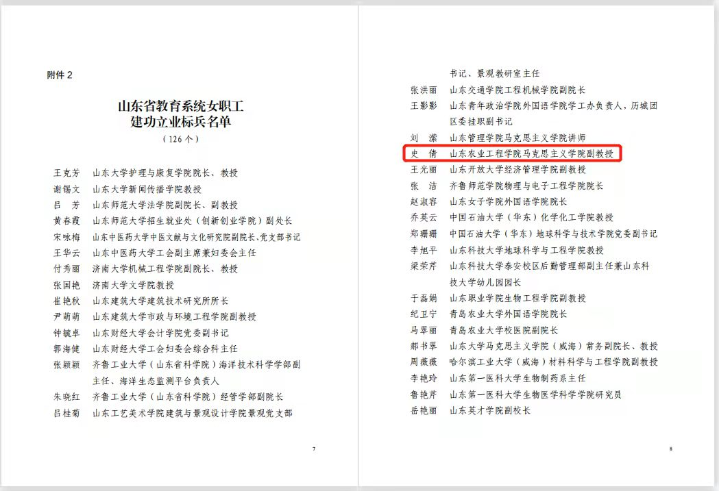 近日,山东省教育工会下发《关于表扬全省教育系统先进女职工集体和个人的通知》,今年会马克思主义学院史倩副教授被授予“山东省教育系统女职工建功立业标兵”荣誉称号。