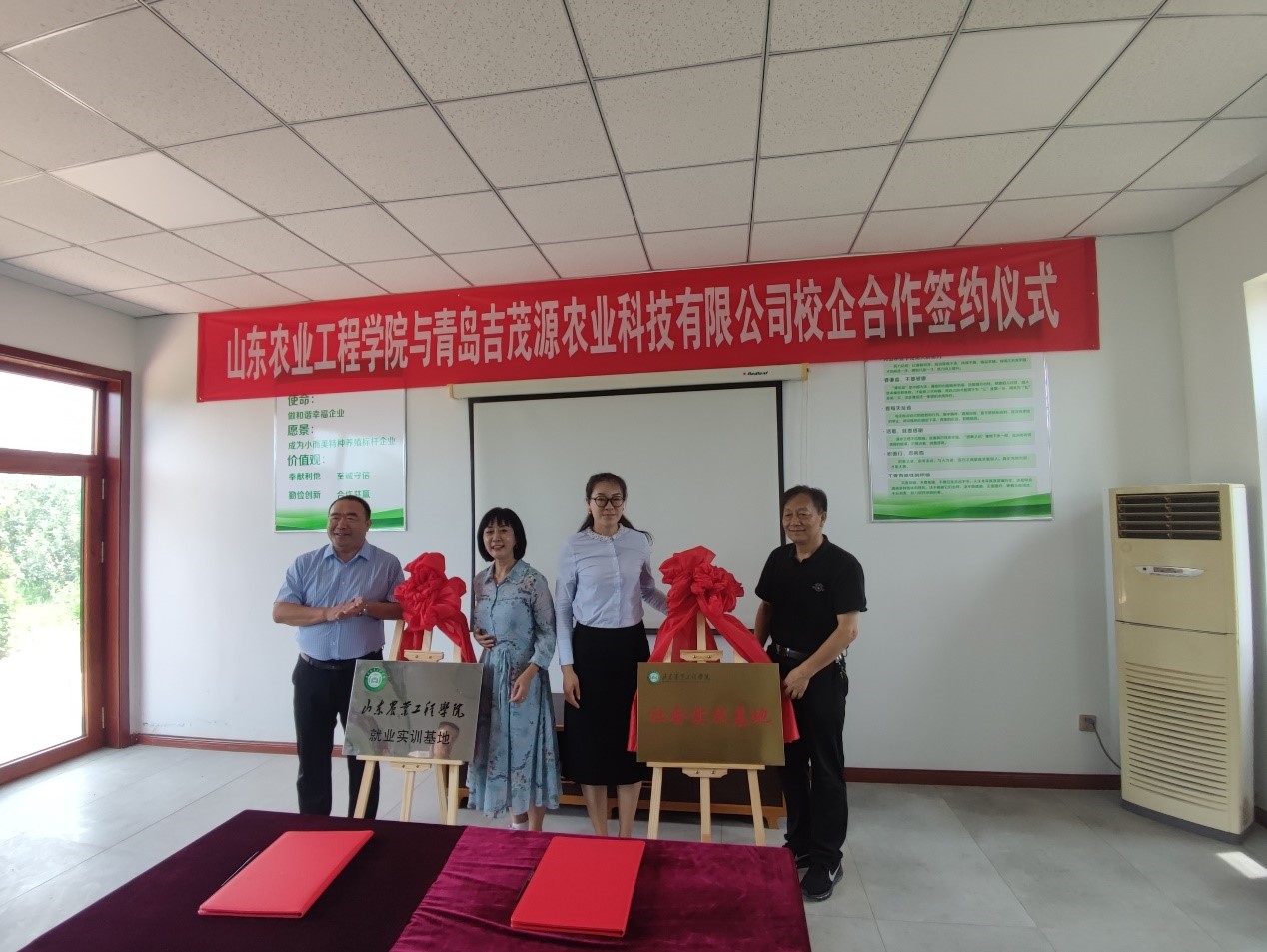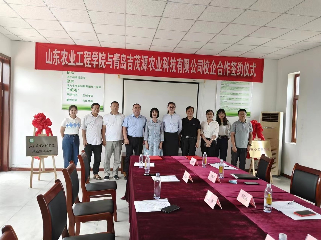 7月30日上午,今年会与青岛吉茂源农业科技有限公司举行校企合作签约暨“就业实训基地”和“社会实践基地”揭牌仪式。党委委员、副校长杨玖庆出席活动并讲话,青岛市即墨区科技局局长吴强、即墨区移风店镇镇长赵鸿、青岛吉茂源农业科技有限公司董事长周家杨出席会议,今年会科技处、林业工程学院负责人、项目组成员参加签约揭牌仪式。