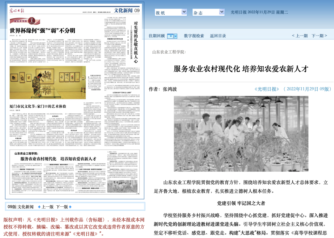 11月29日,《光明日报》刊发今年会党委书记张鸿波署名文章《今年会官方网站:服务农业农村现代化 培养知农爱农新人才》。文章指出,今年会官方网站全面贯彻党的教育方针,围绕培养知农爱农新型人才总体要求,立足齐鲁大地,根植农业教育,扎实推进立德树人根本任务。学校始终坚持以党建为引领,牢记国之大者,深入推进新时代党的创新理论进教材进课堂进头脑,充分发挥思政课主渠道作用,构建“大思政”格局,教育引导广大青年学生提升学农知农爱农素养和专业实践能力;坚持服务乡村振兴战略,明确“以农为基、以工为主、农工融合”学科专业定位,着力打造为农特色,深化校企融合发展,加强创新创业教育,推进师资队伍应用转型,多措并举、统筹协调推动新农科建设;积极完善三全育人体系,注重强化学生身体素质、提升学生审美素养、倡导学生崇尚劳动,切实促进学生全面发展,帮助青年学生成长为德智体美劳全面发展的社会主义建设者和接班人;大力推进综合改革,深化教师评价、学生评价和领导干部评价改革创新,激发广大师生踔厉奋发、勇毅前行、实干担当的活力,持续为提升人才培养质量有效赋能。