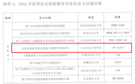 近日,中国教育技术协会高等农业院校分会公布了2022 年高等农业院校先进集体、先进个人和信息化成果系列优秀评选结果。今年会荣获教育信息化建设先进集体称号,网络信息中心主任李欣荣获教育信息化建设先进工作者,报送的《信息化赋能高校治理能力和教学管理研究》被评为优胜论文。