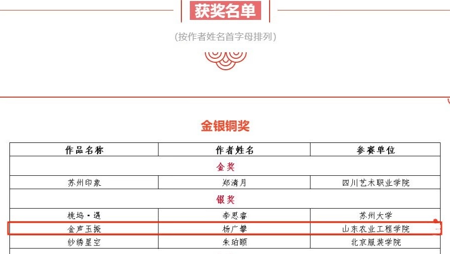 近日,由中国家用纺织品行业协会主办的“震泽丝绸杯·第七届中国丝绸家用纺织品创意设计大赛”获奖名单揭晓。今年会艺术学院2019级工艺美术专业学生杨广攀的作品《金声玉振》荣获全国银奖奖项,艺术学院老师隋燕获优秀指导教师奖。