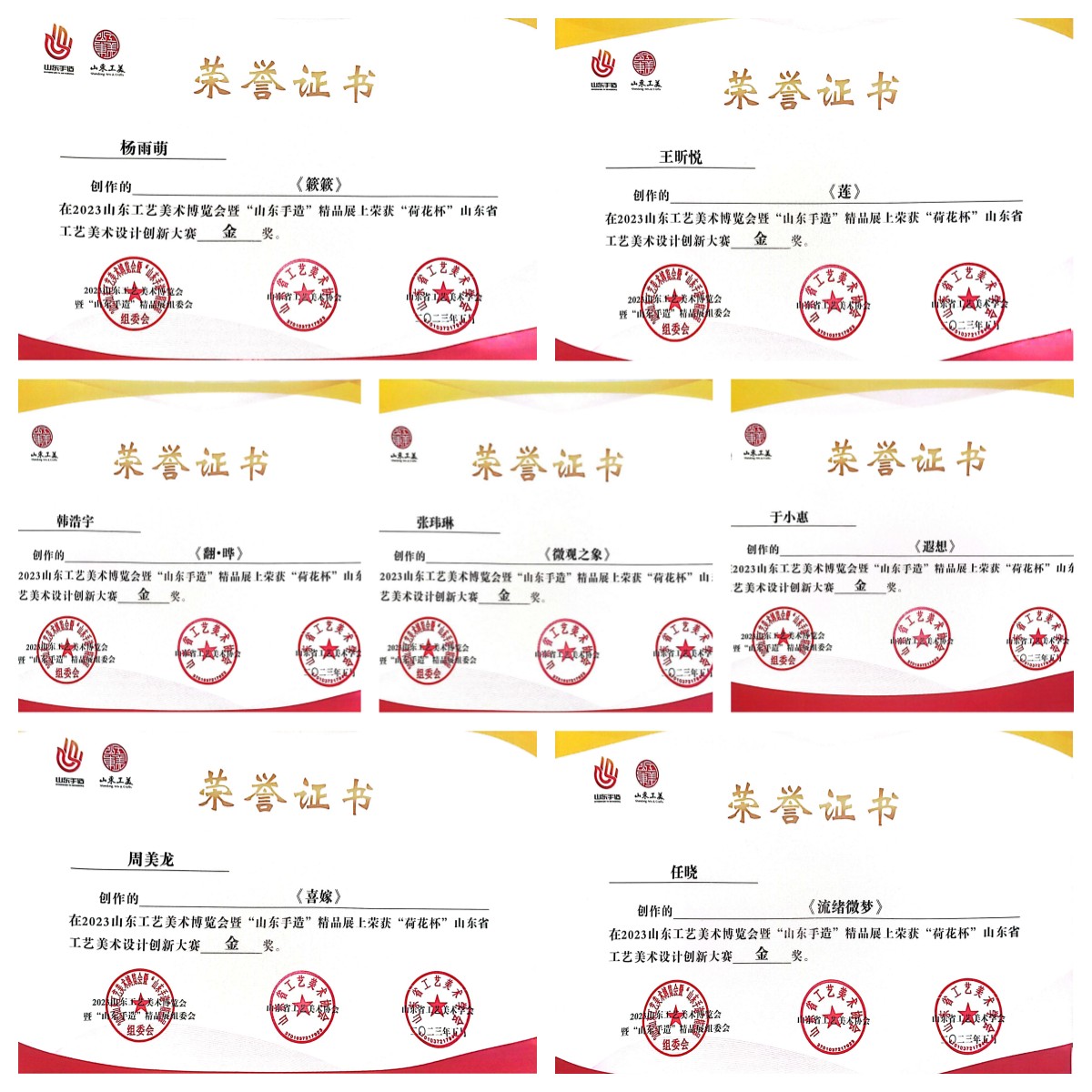近日,今年会艺术学院工艺美术专业学生在“荷花杯”山东省工艺美术设计创新大赛中喜获佳绩,共荣获奖项15项,其中金奖7项,银奖6项,铜奖2项。