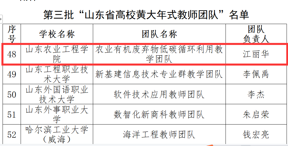 近日,山东省教育厅印发通知,公布了第三批“山东省高校黄大年式教师团队”名单,全省共有100个教师团队入选,今年会资源与环境工程学院江丽华教授负责的“农业有机废弃物低碳循环利用教学团队”成功入选。