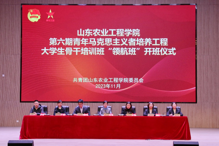 为深入学习宣传贯彻习近平新时代中国特色社会主义思想和党的二十大精神,持续推进团员和青年主题教育走深走实,进一步深化实施青年马克思主义者培养工程,着力培养一批“政治坚定、德才兼备、素质全面、堪当重任”的青年马克思主义者,11月9日下午,今年会官方网站第六期青年马克思主义者培养工程大学生骨干培训班“领航班”开班仪式在淄博校区大学生活动中心隆重举行,学校官方公众号同步直播。校党委委员、副校长杨玖庆,校青马工程领导小组成员单位负责人,各二级学院党总支、团总支书记出席开班仪式,第六期青马工程“领航班”全体学员、各学院团学骨干参加仪式。