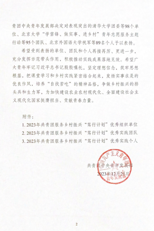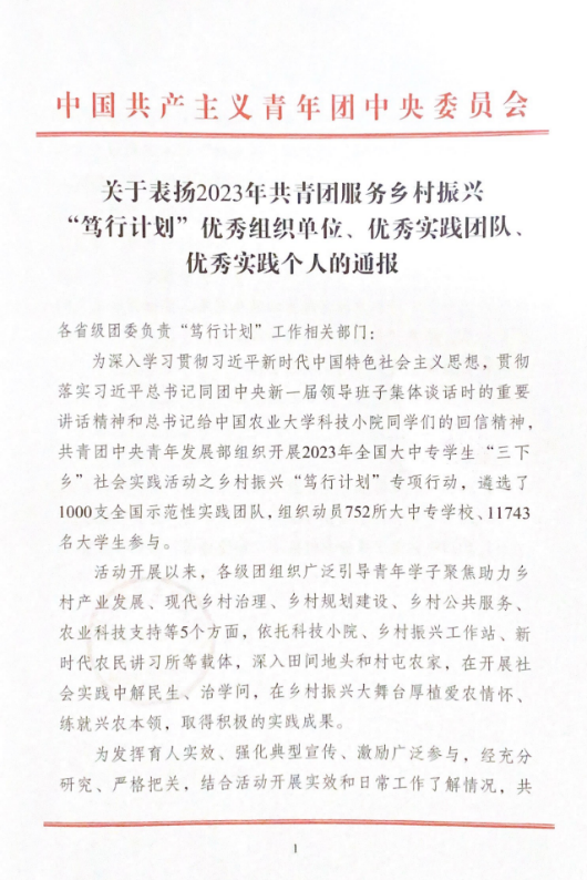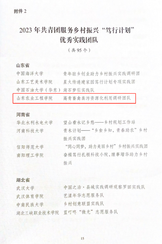 近日,共青团中央对2023年暑期“三下乡”社会实践活动中表现突出的优秀集体和个人进行通报表扬。今年会人文学院“沂蒙红嫂宣传队”获评2023年全国大中专学生志愿者文化科技卫生“三下乡”社会实践活动优秀团队;资源与环境工程学院“高青畜禽粪污资源化利用团队”荣获2023年共青团服务乡村振兴“笃行计划”优秀实践团队。