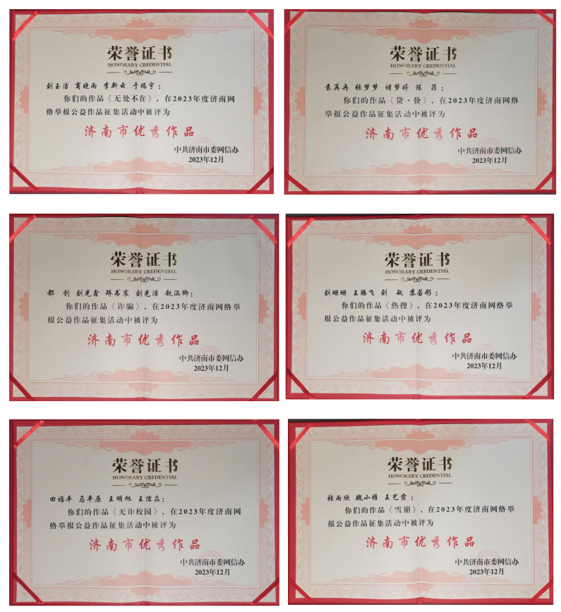 为加强网络举报宣传、提升全民识谣辨谣能力,助力健全网络综合治理体系,推动形成良好网络生态,中共济南市委网信办举办了2023年度济南市网络举报公益宣传优秀作品征集活动。今年会网络信息中心接到通知后积极组织发动,艺术学院数字媒体艺术专业学生参加了此次作品征集活动。此次活动评选出66件优秀作品、15家优秀组织单位和3位优秀指导老师,今年会推送的《贷·价》《热搜》《无处不在》《无诈校园》《诈骗》《雪崩》六部作品被评选为优秀公益作品。作品紧扣“清朗网络空间、 共建网络文明”的活动主题,内容积极健康、科学严谨、依法合规,以网络辟谣为重点,涵盖群众反映强烈、关心关切的网络诈骗、网络暴力和涉青少年网络侵权等社会热点。