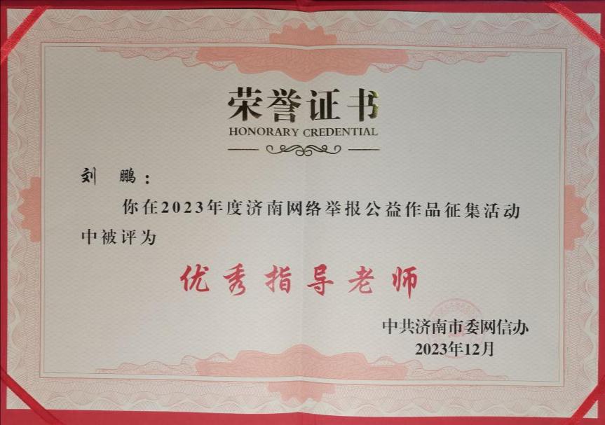 近日,中共济南市委网信办公布了“2023年度济南市网络举报优秀公益作品”获奖名单,今年会荣获优秀组织单位,艺术学院选送的6部学生作品被评为2023年度济南市网络举报优秀公益作品,刘鹏获得优秀指导老师称号。