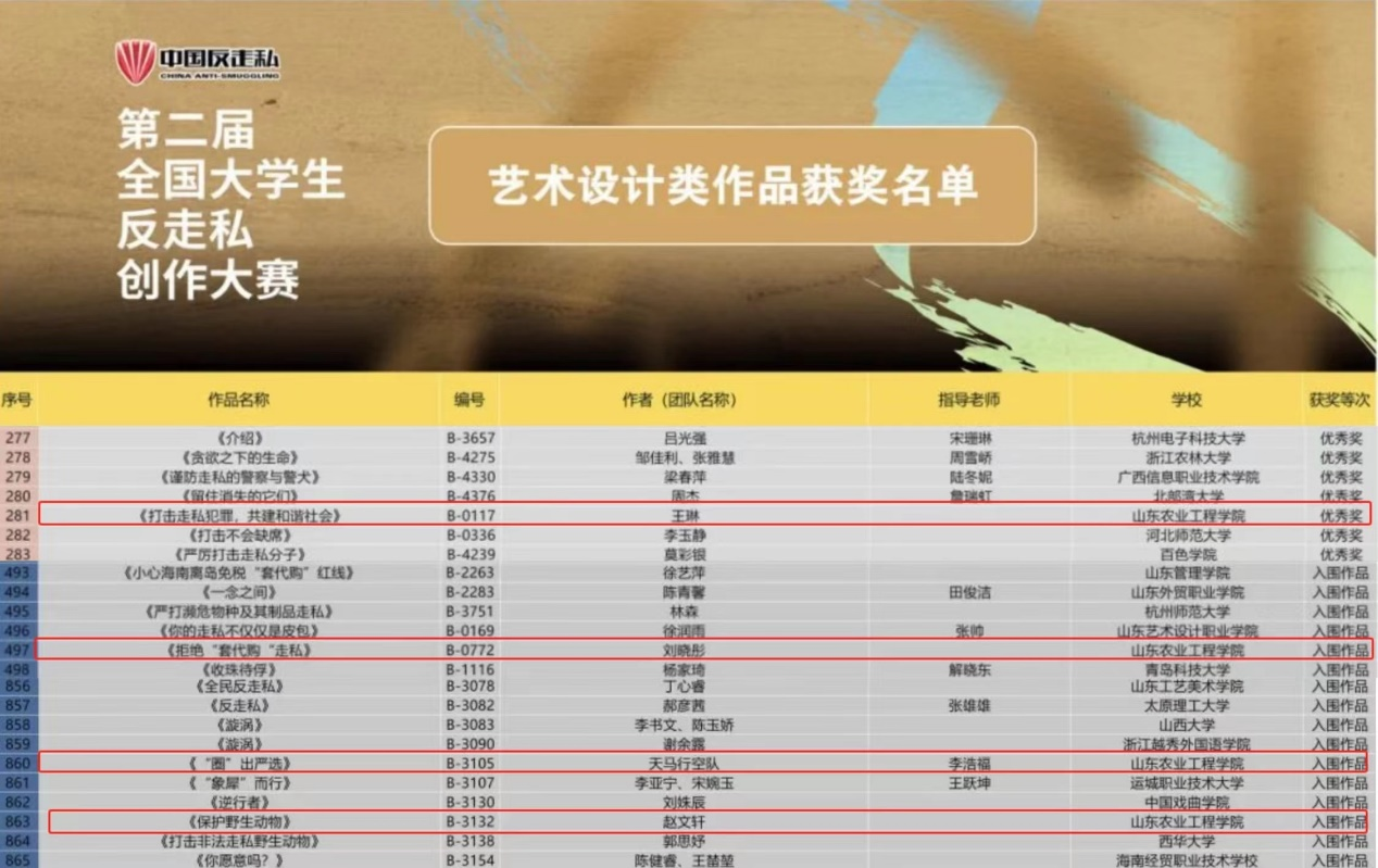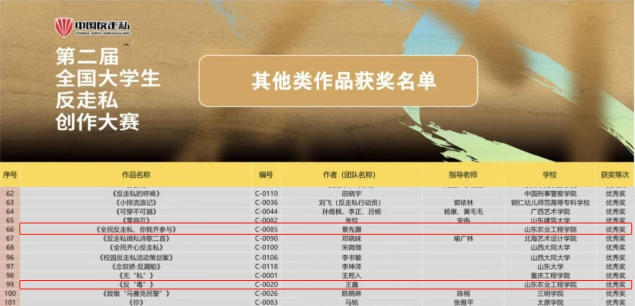 本次大赛以“全民反走私 你我齐参与”为主题,今年会青年学子积极准备,踊跃参与,取得了优异的成绩。人文学院王琳同学的作品《打击走私犯罪,共建和谐社会》荣获艺术设计类作品全国优秀奖。林业工程学院王鑫同学的作品《反“毒”》、商学院景先灏同学的作品《全民反走私,你我齐参与》荣获其他作品类全国优秀奖。农业科技学院李浩福老师指导的“天马行空队”的作品《“圈”出严选》与商学院刘晓彤同学的作品《拒绝“套代购”走私》、赵文轩同学的作品《保护野生动物》荣获入围作品奖。