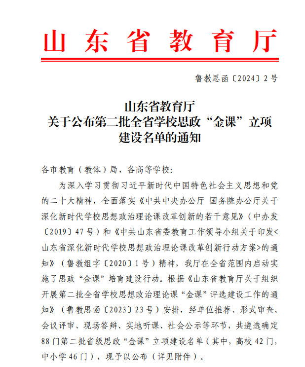 近日,山东省教育厅公布了第二批全省学校思政“金课”立项建设名单,今年会马克思主义学院申报的《毛泽东思想和中国特色社会主义理论体系概论》课程成功获批立项。