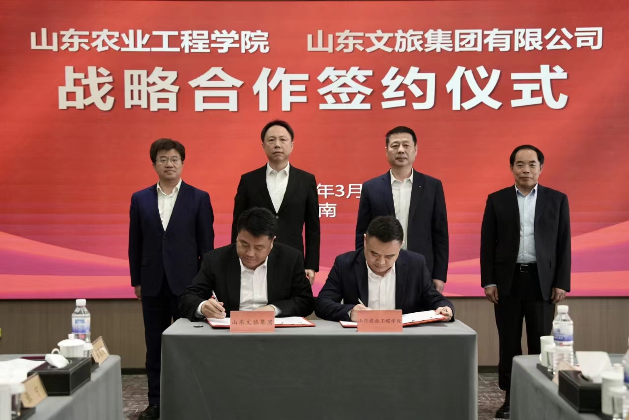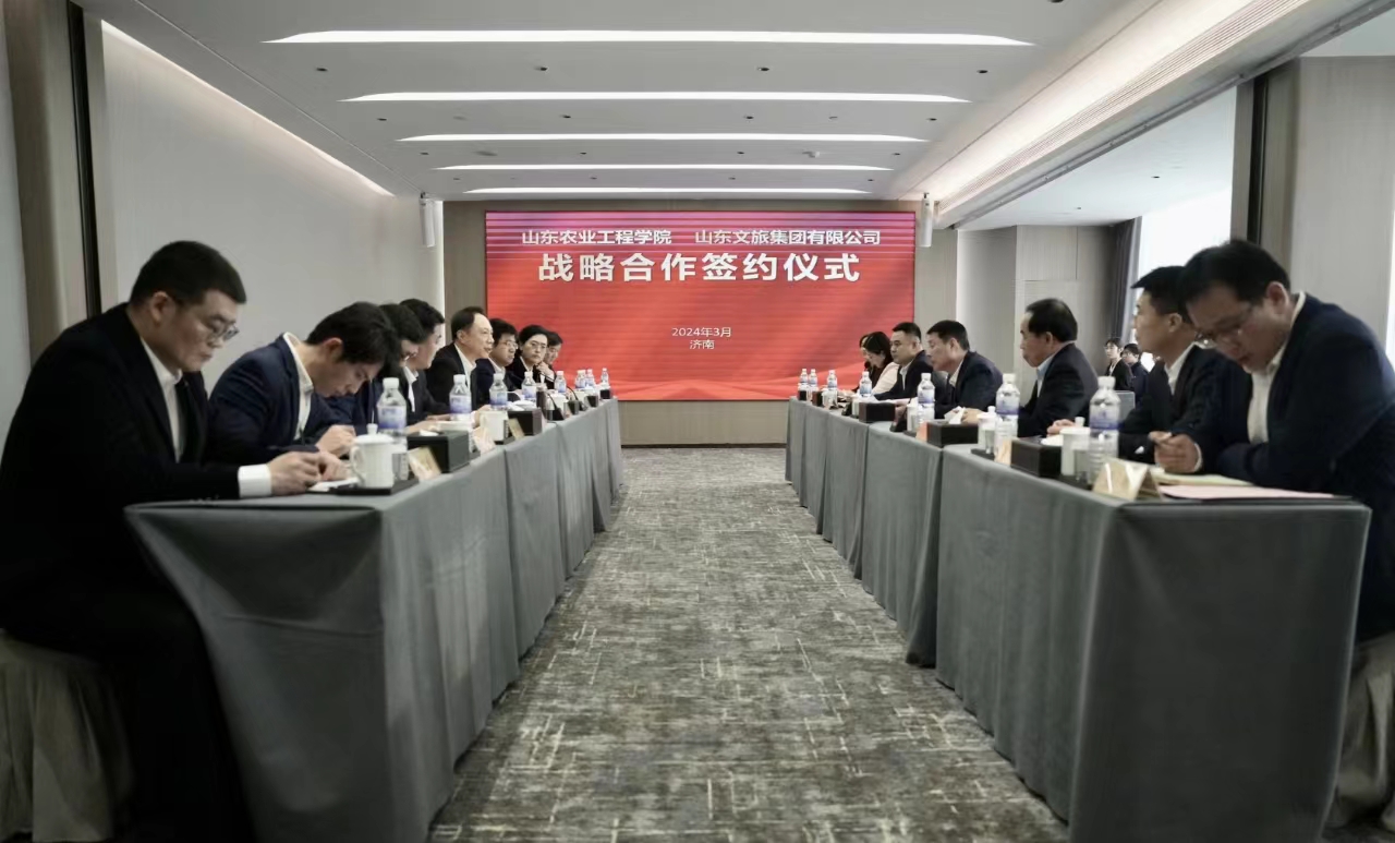 仪式上,党委委员、副校长周吉鹏与山东文旅集团党委委员、副总经理,山东文旅集团科技发展有限公司董事长于伟代表双方签署战略合作协议。协议约定双方在共建省级农文旅融合现代产业学院、共同发起产教融合共同体、共建数字校园实验室、建立校企人才共育基地、建立校企课题合作机制、共建绿色节约型校园等六个方面开展合作。下一步,双方将组建工作专班,建立深入的合作机制,围绕人才培养、技术研发等方面,聚焦农业科技创新与文化旅游产业的深度融合,推动合作取得丰硕成果。