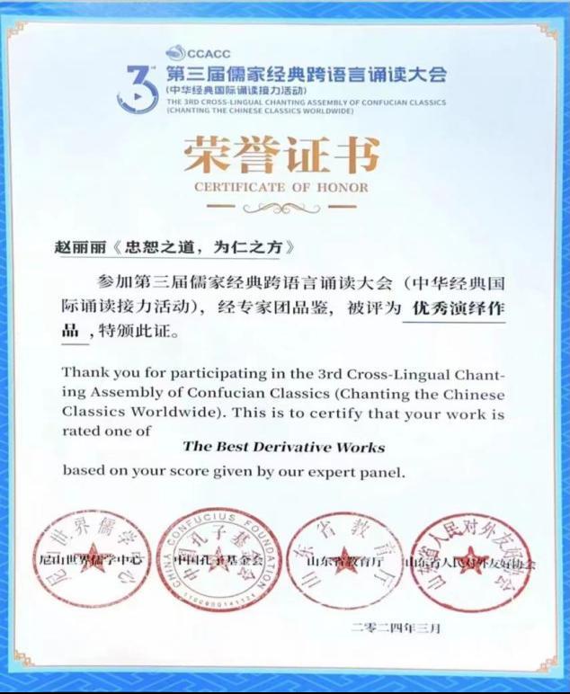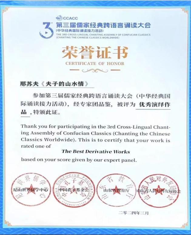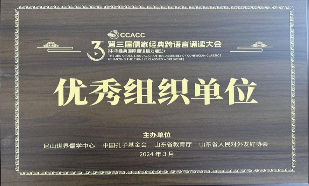 近日,“第三届儒家经典跨语言诵读大会(中华经典国际诵读接力活动)”年度盛典在济南举行,今年会选送的多部作品从参赛的12400余件作品中脱颖而出,喜获大赛“银奖”“铜奖”“最佳演绎奖”等多项大奖,今年会获评“优秀组织单位”荣誉称号。