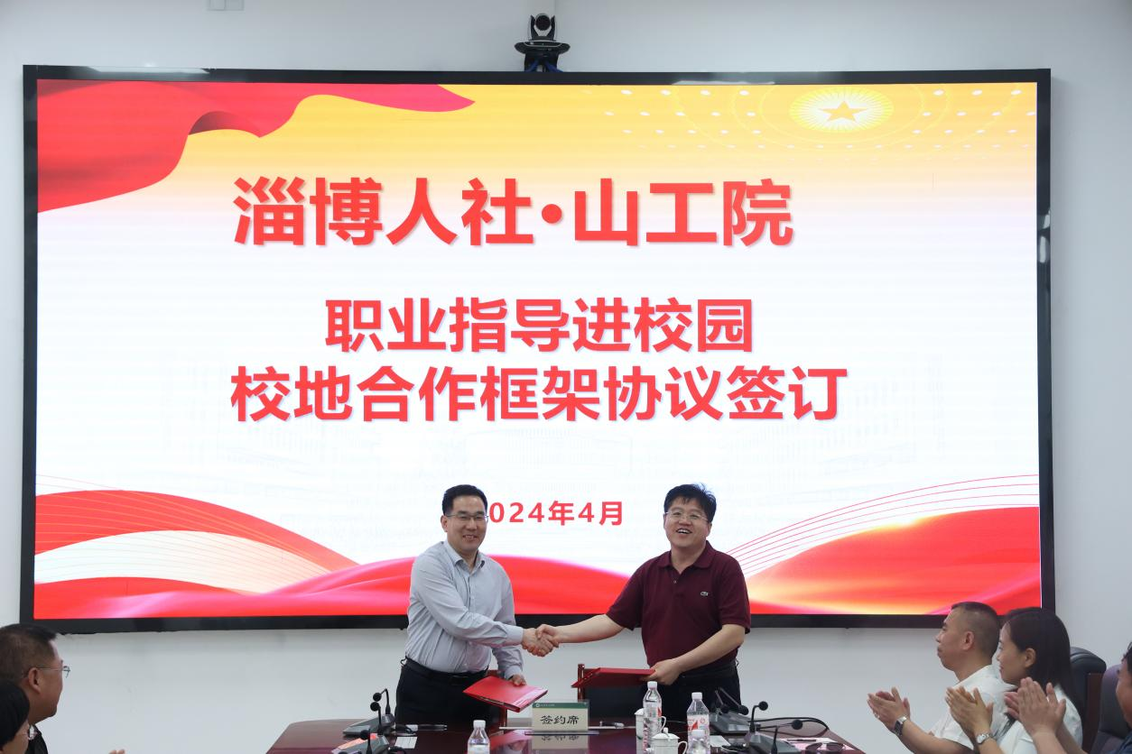 学校与淄博市签订职业指导合作框架协议,聘请淄川区职业指导齐秀华工作室为首批就业指导合作团队。与新泰市签订校地人才合作框架协议,并为“新泰市招才引智工作站”揭牌。