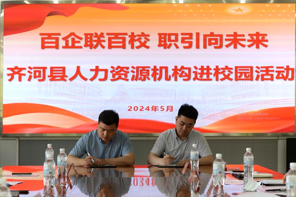 齐河校区招聘会期间,学校与齐河县人力资源机构开展“百企联百校、职引向未来”座谈会。会上,陈献锋对齐河县人社局党组副书记张勇和企业代表表示欢迎,并感谢多年来齐河县给予的支持与帮助。他强调,通过本次活动,学校与齐河县必将实现更紧密、更深入、更高层次合作。会上,就业指导中心与齐河县人力资源产业园签订合作框架协议。
