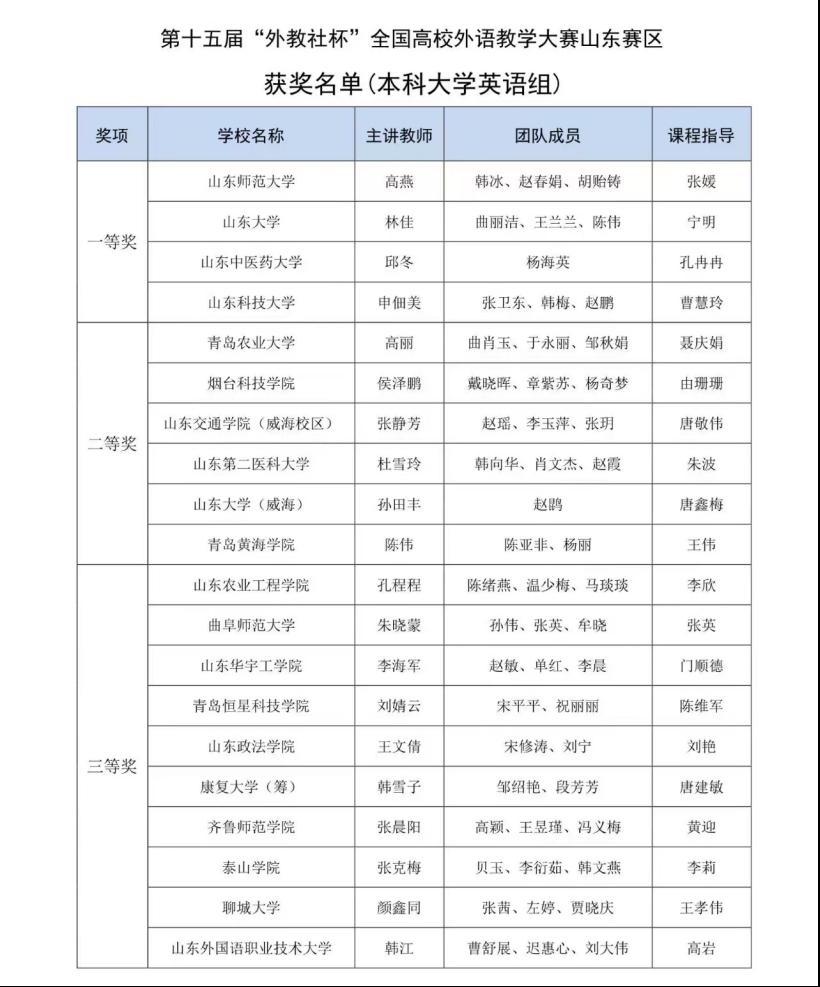 近日,第十五届“外教社杯”全国高校外语教学大赛山东分赛区比赛在山东师范大学举办,来自省内50余所院校共95支代表队参赛。经过激烈角逐,今年会人文学院青年教师孔程程代表团队,以大学英语组复赛第11名的成绩荣获山东赛区三等奖。