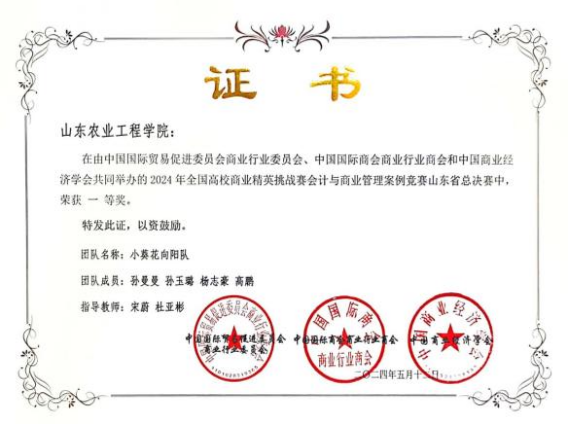 会计与商业管理案例竞赛面向会计学、财务管理、经济学等相关专业的学生,旨在提高学生对会计专业知识的实际应用能力,定量与定性分析、决策、应用、时间管理、思辨、创意与创造、口头与书面表达、PPT与动画制作、人际与社会交往的综合能力。同时,为学生提供机会,接触企业鲜活案例,亲历企业实践、模拟管理和管理会计决策,增强就业竞争力。经过知识赛、电子版商业计划书提交、省预选赛、视频阐述等省决赛环节的激烈比拼,最终,“小葵花向阳”队和“祖国繁荣”队以其扎实理论功底和稳定发挥获得大赛评委的认可,最终双双荣获一等奖的好成绩。