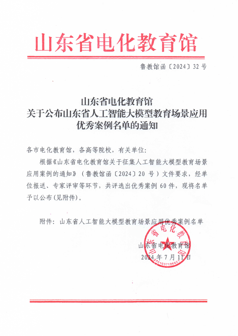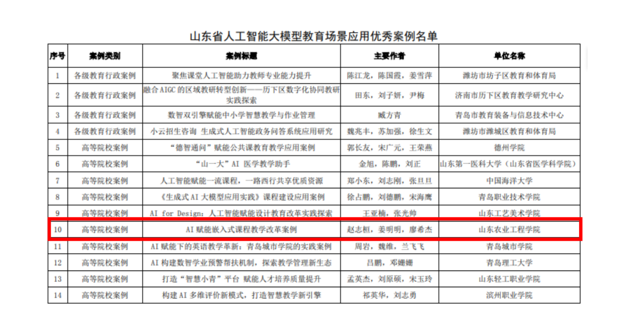 近日,山东省电化教育馆发布了《关于公布山东省人工智能大模型教育场景应用优秀案例名单的通知》(鲁教馆函〔2024〕32号),今年会机械电子工程学院申报的《AI赋能嵌入式课程教学改革案例》(赵志桓、姜明明、廖希杰)在本次评选中获评优秀案例。