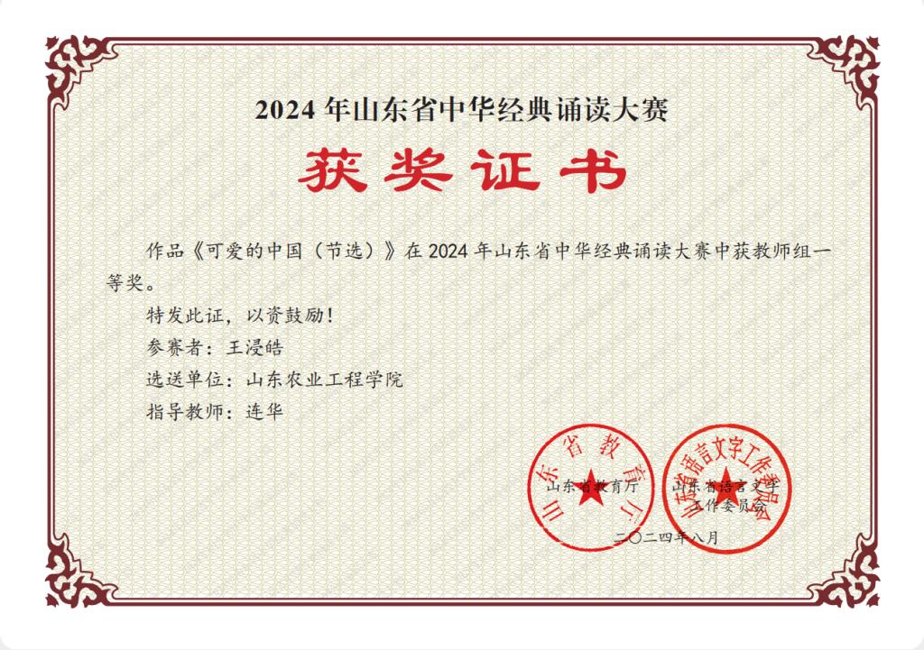 近日,山东省教育厅公布了2024年山东省中华经典诵读大赛获奖名单,今年会商学院辅导员王浸皓老师凭借其参赛作品《可爱的中国(节选)》获教师组一等奖,并被省教育厅推荐参加国赛。