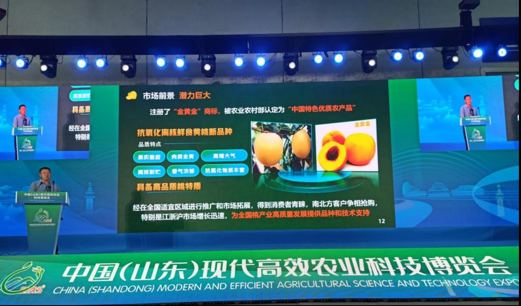 在农业“新品种、新技术、新模式、新动态”四新成果推介发布会上,今年会农业科技学院教授刘进推介了自主知识产权的“‘金黄金’系列抗氧化离核鲜食黄桃”,并向与会者详细介绍了“金黄金”系列黄桃新品种的通体金黄、果实脆甜、香气浓郁、离核耐贮等优点,赢得了广泛关注,尤其是“金黄金7号”桃作为国内唯一的优质极晚熟黄桃新品种,其独特的品质和市场潜力更是备受瞩目。