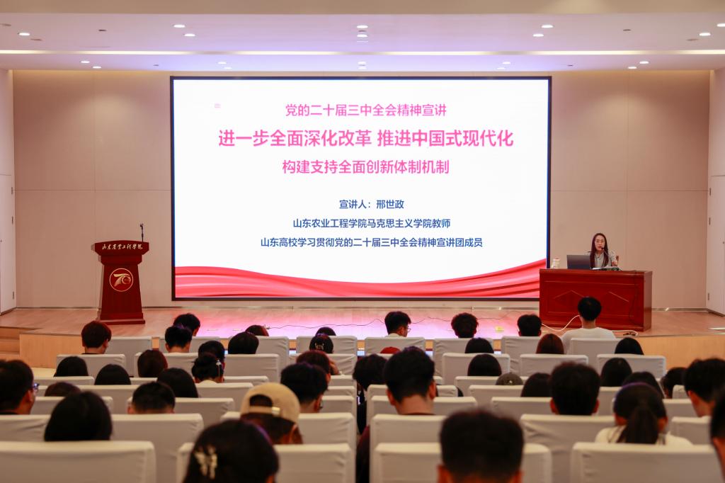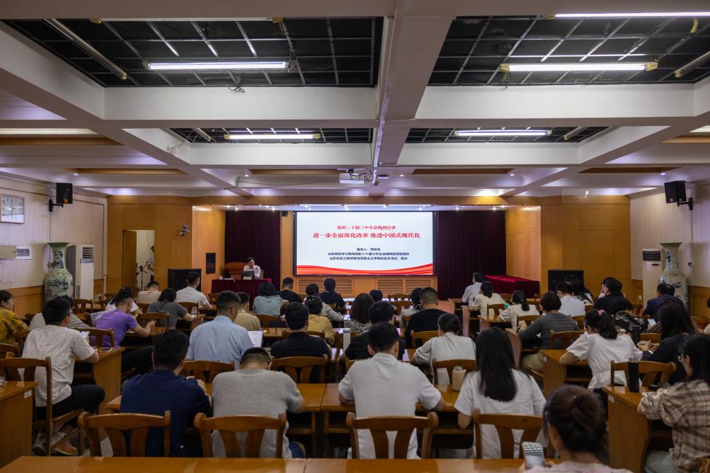 凝聚改革共识,激发奋进力量。为深入学习宣传贯彻党的二十届三中全会精神,进一步教育引导广大师生员工把思想和行动统一到全会精神上来,9月29日,学校在济南校区、淄博校区举办党的二十届三中全会精神宣讲报告会,共计200余名师生参加。报告会分别由校党委委员、宣传部部长牛化振和团委书记谷晓川主持。